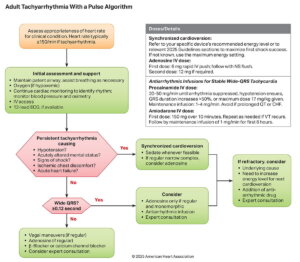 • Always rule out secondary causes of tachycardia (e.g., fever, sepsis, hypovolemia) before initiating electrical or pharmacologic intervention.