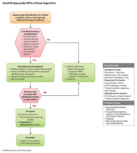 • Step 5: For high-degree AV block, consider immediate pacing if IV/IO access is delayed.