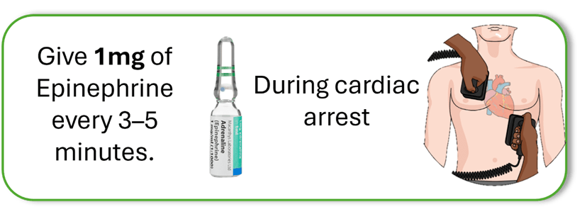 2Give 1 mg of epinephrine every 3–5 minutes during cardiac arrest.Standard dosing remains best practice; high- or low-dose regimens offer no proven advantage.