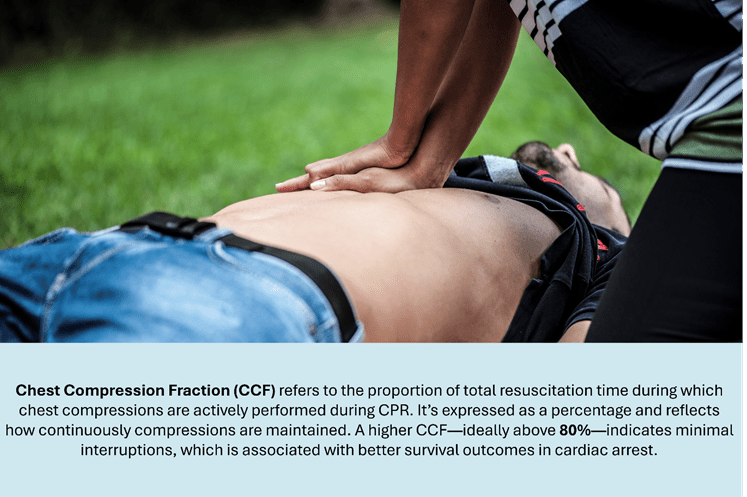| Compression Fraction Goal | Aim for a compression fraction of at least 60% — meaning compressions are performed for at least 60% of total resuscitation time. Higher fractions (above 80%) are associated with improved outcomes. |