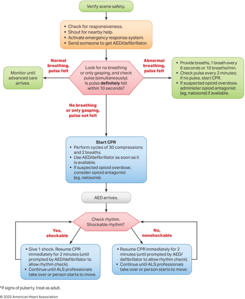 Immediate action remains critical. The AHA 2025 update clarifies differences between trained lay rescuers and professional responders.